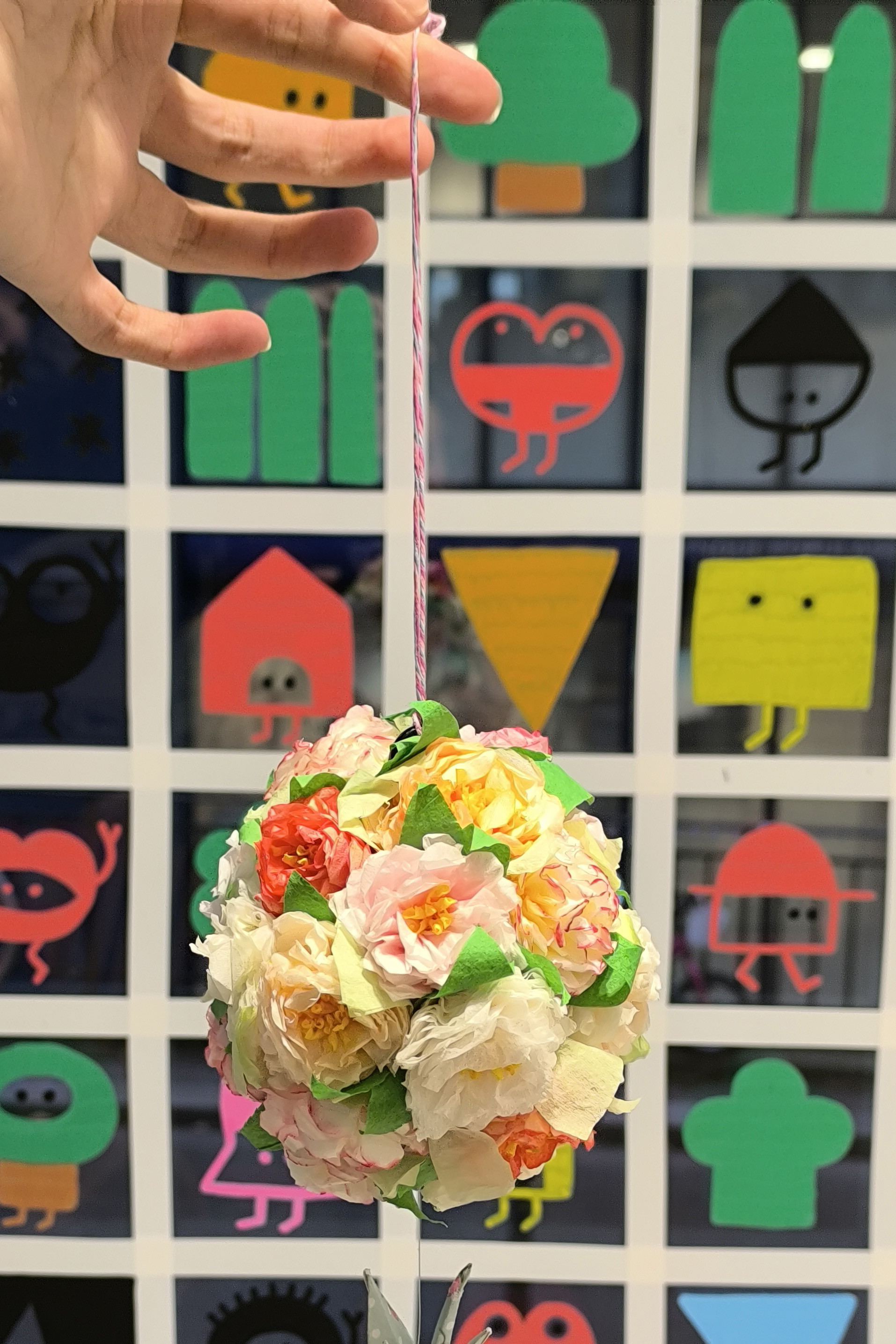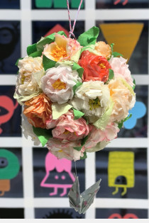Paper collage and origami, acrylic and watercolour paint, beads, on beech wood ball