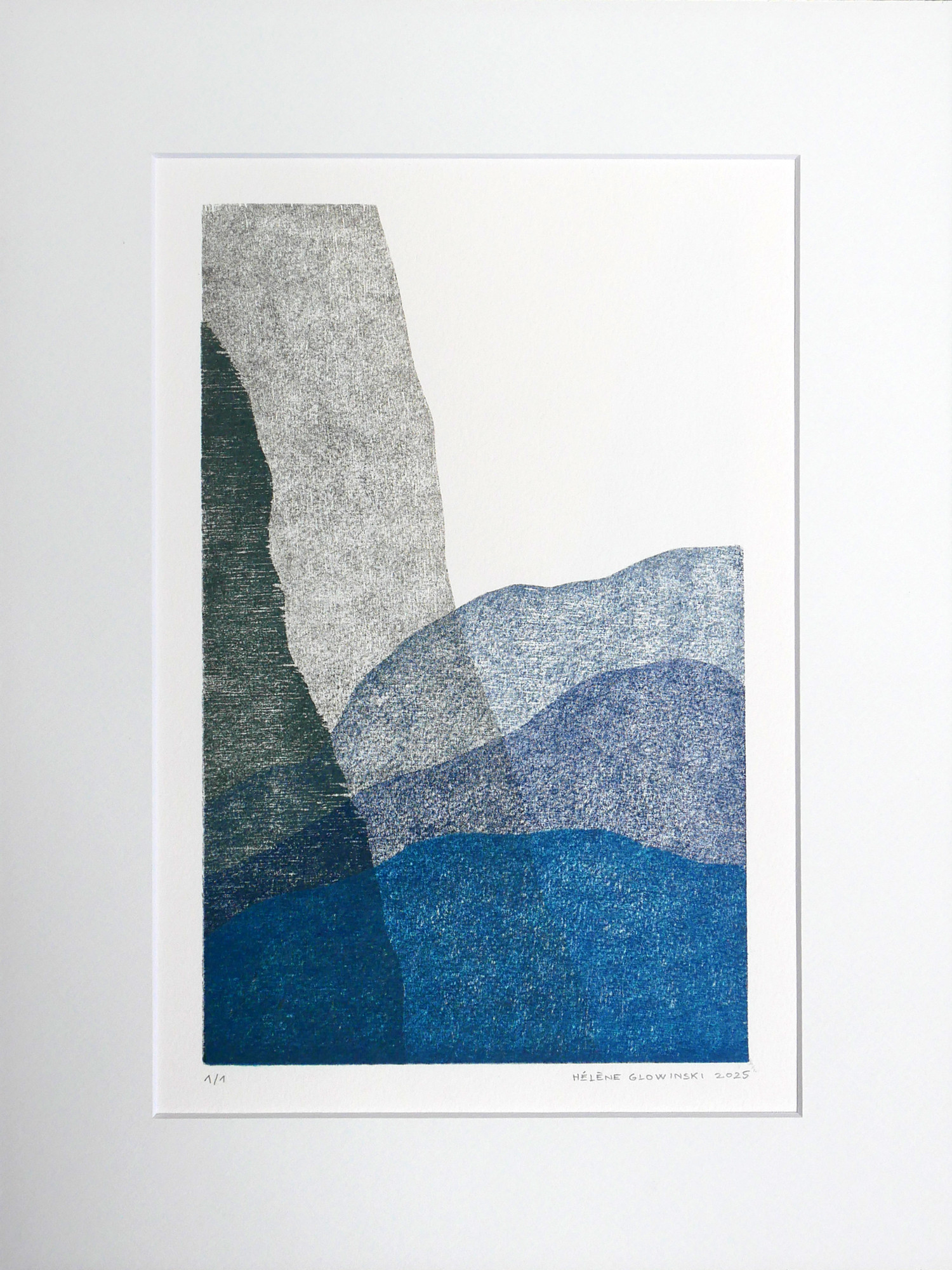 La toute première estampe d’Hélène Glowinski est un motif gravé dans une plaque de contreplaqué. Associé à d’autres, ils sont devenus jeux. Jeu d’association ou jeu de lettres, ses dessins graphiques se découpaient en cartes à jouer et à manipuler. Plus tard, Hélène s’est détachée de l’objet pour aller vers l’image. En changeant l’orientation et l’encrage…